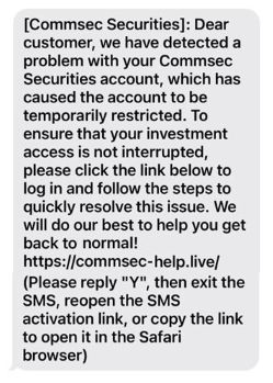 CommSec is aware of a fraudulent SMS in circulation, claiming to alert customers that they've been locked out of their account due to "unusual activity" and instructing them to "restore their access" by clicking on a provided link.