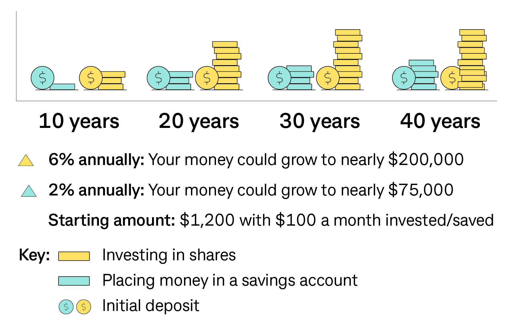 Let's compare investing and saving over 40 years. Imagine you're 25 years old and plan to retire at 65. If you invest $100 per month in a fund tracking the stock market, starting with an initial deposit of $1,200 and growing at 6% annually, your money could grow to nearly $200,000. In contrast, the same amount in a savings account with a 2% annual return might grow to just about $75,000. Why the difference? Stocks are riskier but offer higher growth potential. Savings accounts are more stable but have less growth potential.