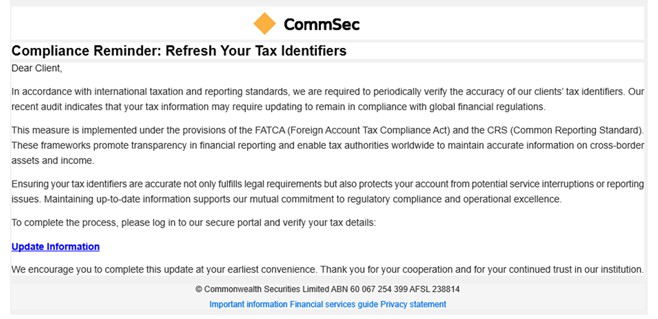 CommSec has detected a new round of phishing emails designed to capture CommSec login credentials – see example screenshots below.
